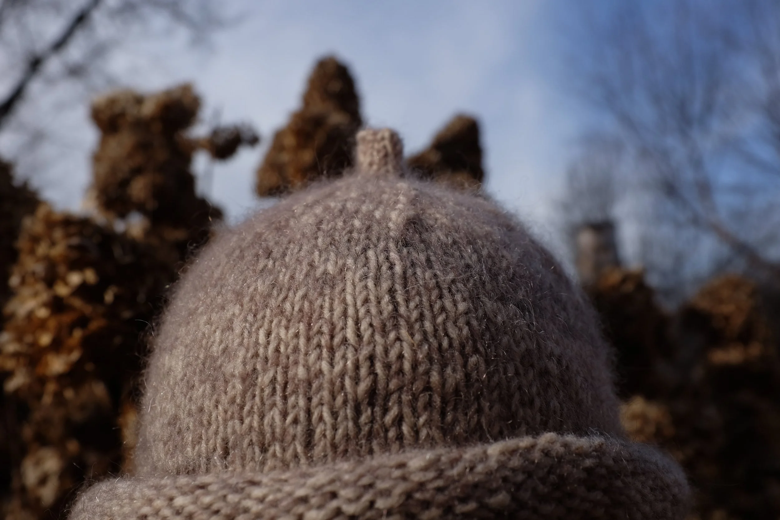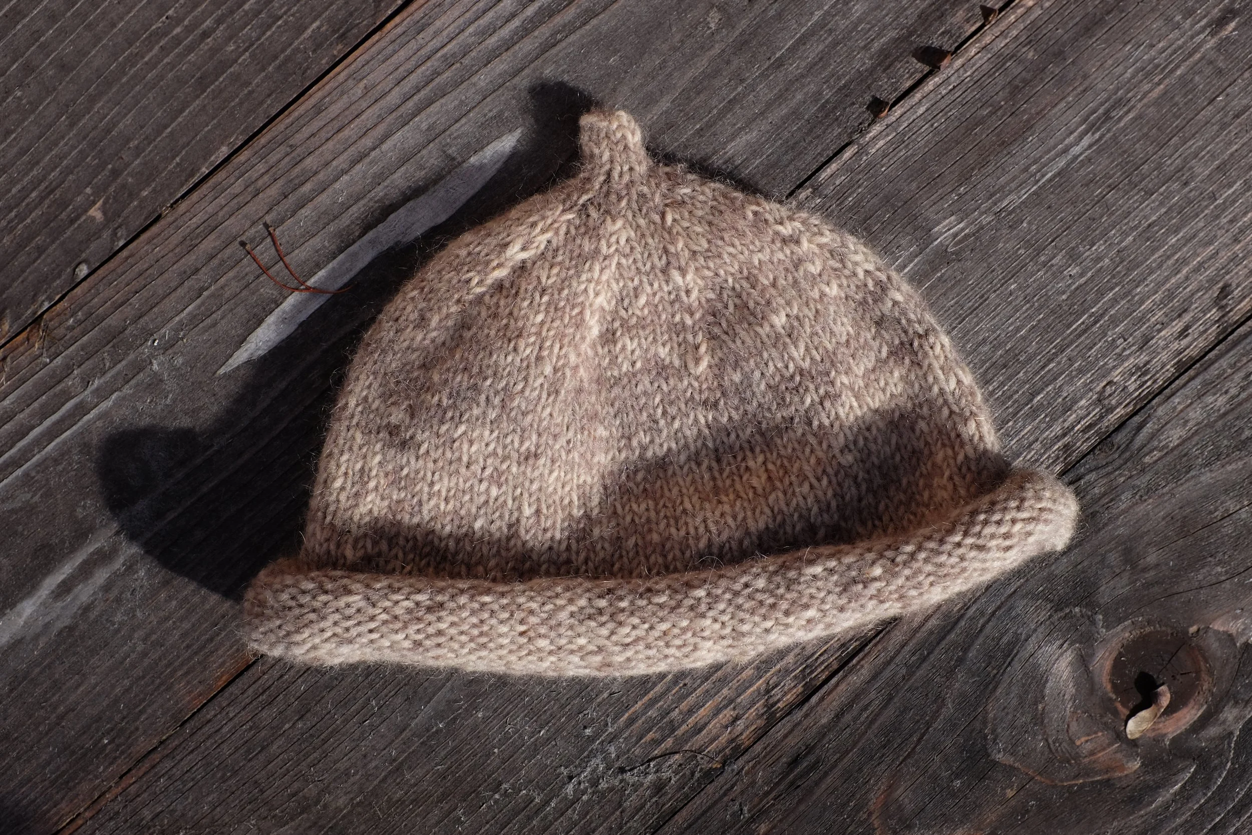 A hat that will ride the shoulder season into spring. This is an easy bottom up pattern that just about any knitter can handle with some simple decreases at the crown and a couple mini repeats for the sprout. Stockinette stitch makes for a slim mid-weight fabric and makes it a great hat to slosh through the spring thaw. The roll brim makes it easy to adjust the height of the hat to its owner. Wear it long on cold mornings or over the ears once the bulbs have popped out of the ground and you want to lean in for a listen.